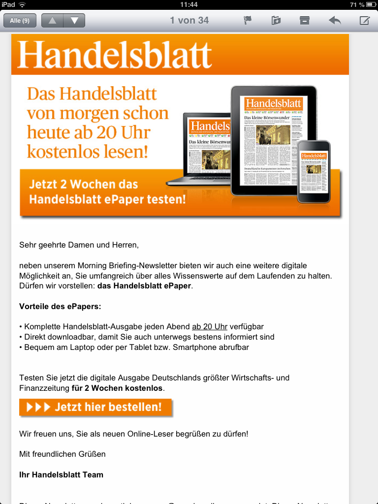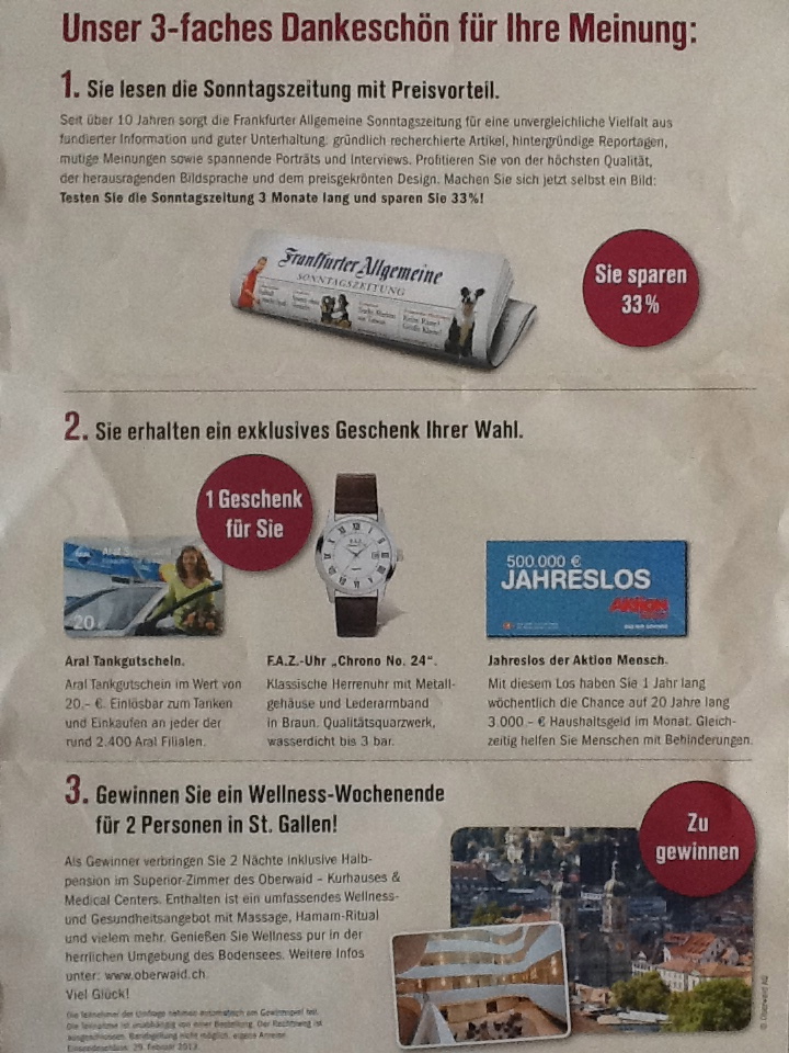 Heute bekam ich diese E-Mail vom Handelsblatt und vor drei Wochen den folgenden Brief der FAS (getarnt als Pseudo-Umfrage):