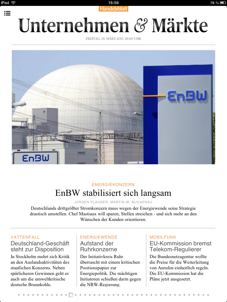 Das Design der Artikelseiten und der Übersichtseiten mag ich ganz spontan. Viel Weißraum, dezenter Farbeinsatz der Hausfarbe, das Layout ist einspaltig mit einer Seitenleiste links, die Serifenschrift ist auch auf meinem alten iPad 2 gut lesbar. Photos stehen in der Regel am Anfang jeden Artikels. Die Seite springt problemlos und schnell von vertikal auf horizontal. Um es kurz zu machen: Was ich schon vermutete, Layout und technische Umsetzung sieht ordentlich aus und es passt zum Handelsblatt wie ich es sonst kenne – vom Chaos der Website mal abgesehen. Werbung ist in der App auch schon. Ganzseitig und interaktiv, d.h. ich kann auf weitere Informationen tippen oder auf die Website weitergehen. Die Werbung stört nicht, sie ist anders als auf der Website oder in der Printausgabe nicht kleinteilig. Das bleibt hoffentlich auch so und das wünsche ich Verlag und IQ digital!