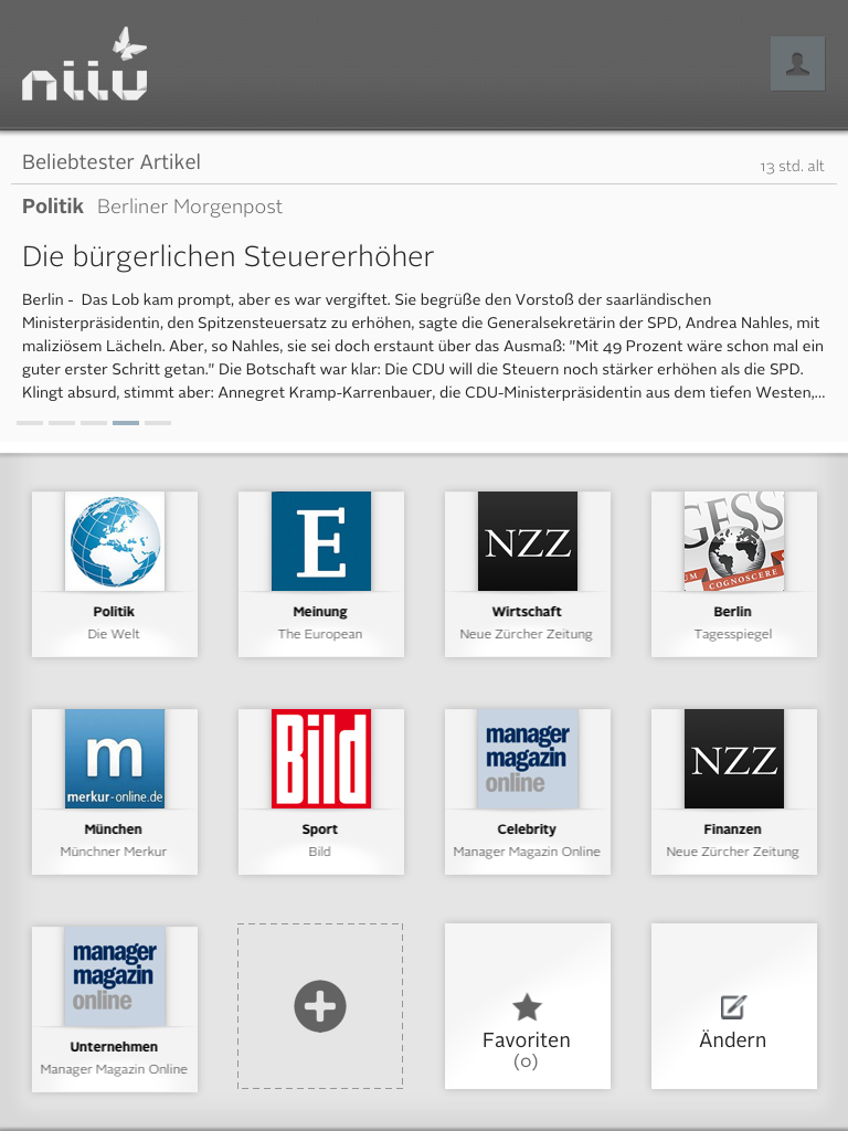 Niiu hat den Anspruch eine individuelle, personalisierte Zeitung mit relevantem Content sein zu wollen. Über beteiligte Verlage, die Macher, die Preise etc. kann man sich z. B. bei print.de informieren. Unabhängig von den tagesaktuellen Inhalten will ich mir jetzt mal ein Bild von der App, dem Aufbau, der Ästhetik machen.