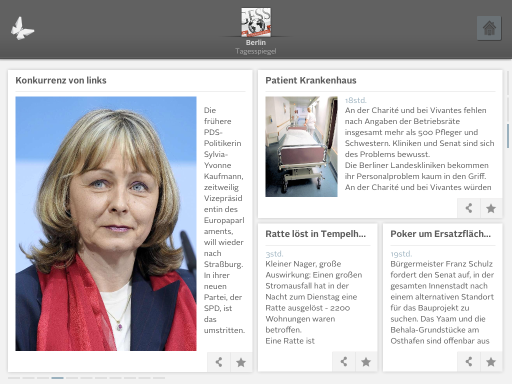 Jeder Artikel bietet die Möglichkeit des Sharings per Facebook, Twitter oder Mail. Noch funktioniert das nicht, aber vermutlich ab 2.4.13. Der Stern lässt den Artikel in meine Favoriten-Box laufen. Mit Rauf-Runter-Wischen komme ich zu den anderen Beiträgen der Rubrik, mit Links-Rechts-Wischen kann ich zwischen den Rubriken wechseln.